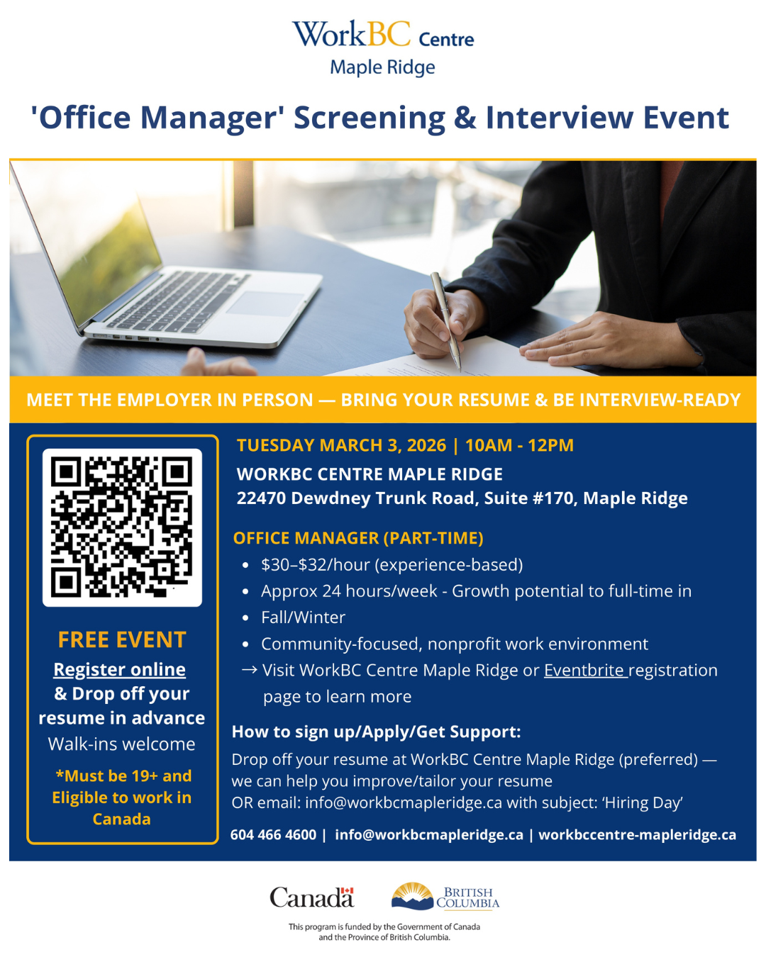 Join us for an in-person screening and interview event for a Part-Time Office Manager role with a well‑established, community-focused organization in Maple Ridge.